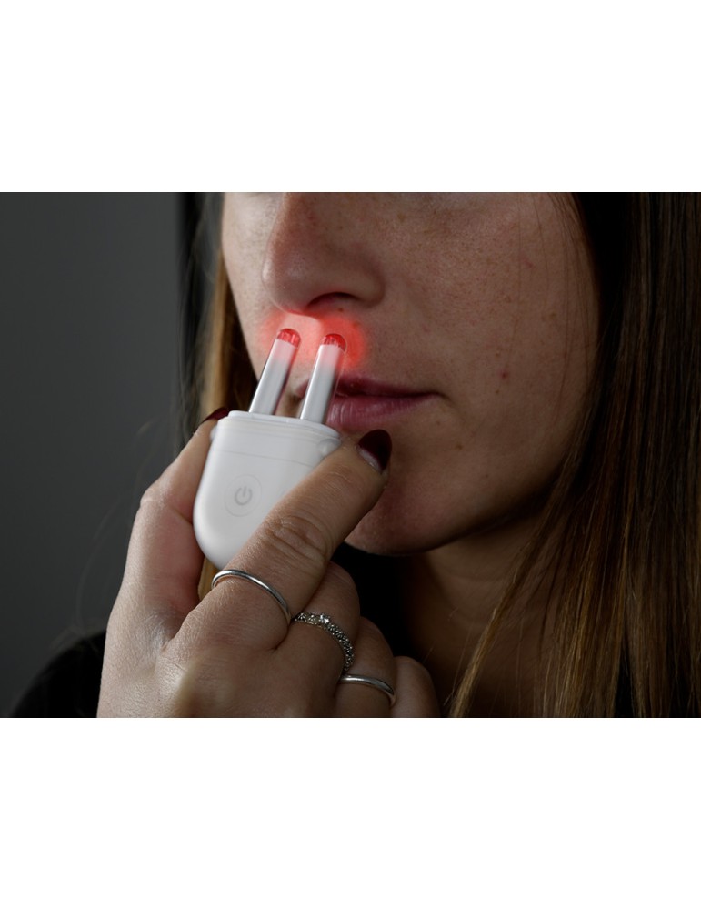 Apparatet tilbyder en innovativ og effektiv metode til efter et par behandlinger at lindre symptomerne forbundet med allergisk rhinitis, såsom rindende øjne, løbende næse og nysen. Sikker, hurtig, bærbar og nem at bruge. Det virker ved hjælp af fototerapi med to forskellige bølgelængder: den ene (infrarødt lys) producerer små mængder varme for at forbedre blodgennemstrømning og cirkulation, mens den anden (rødt lys) eliminerer celler, der frigiver histamin og mindsker inflammation, hvilket lindrer symptomerne på irritation forårsaget af allergisk rhinitis.