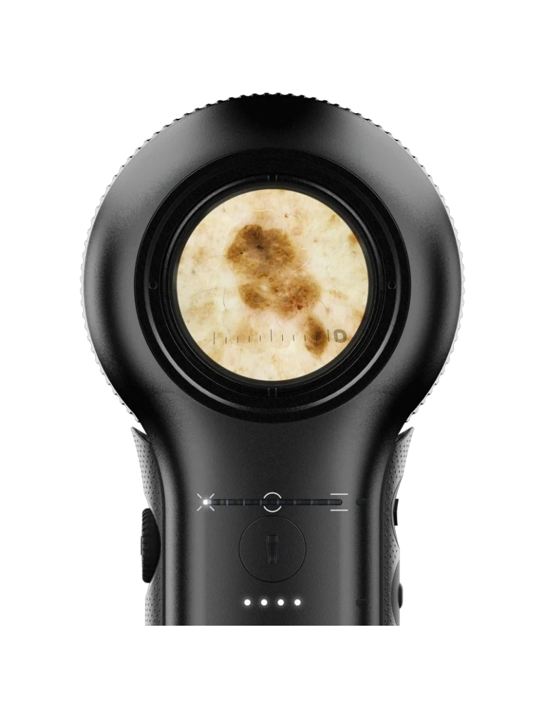Intet problem, udover afstandsstykket med integreret millimeterskala integrerer Dermlite DL5 en praktisk og elegant 100 mm metallineal med magnetisk kobling i håndtaget, hvor diametrene fra 1 til 8 mm også er indgraveret for hurtigt at identificere den nøjagtige kaliber af stemplet, der skal bruges til eventuel excisionsbiopsi.
