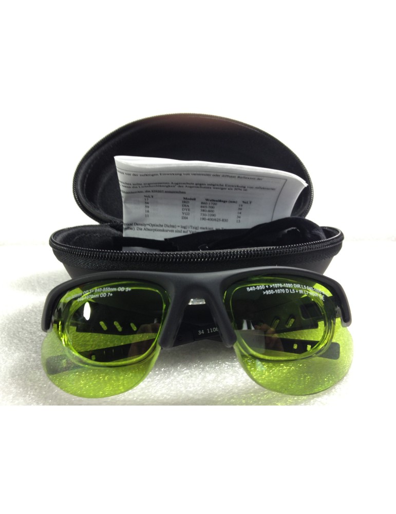 Diodelaserlyssikkerhedsbriller med lav optisk densitet , med etui, rem og mikrofiberklud til rengøring.