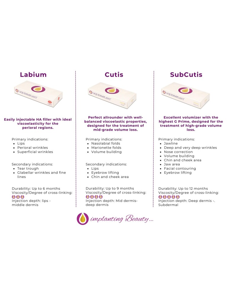 Liquidimplant®-serien omfatter Liquidimplant® Cutis, Liquidimplant® SubCutis og Liquidimplant® Labium, der primært er designet til behandling af mild til svær volumentab i ansigtet. Alle tre produkter har en HA-koncentration på 25 mg/ml og indeholder 90% tværbundet hyaluronsyre. Liquidimplant® bruger kun de bedste råmaterialer, hvilket sikrer høj patienttilfredshed og sikkerhed ved påføring. De medfølgende TSK 27G-nåle sikrer præcision under påføring. Seriens optimerede gelegenskaber fører til fremragende og langvarige resultater i op til 12 måneder. Brugen af sterile glassprøjter af høj kvalitet fra BD (Becton Dickinson) understreger yderligere Liquidimplant®s kvalitet. Sprøjtekroppen er designet til et ideelt greb, hvilket gør påføringen mere præcis og behagelig.