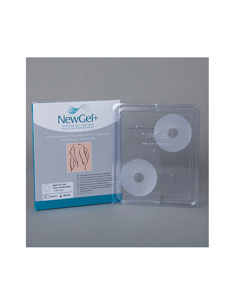 NewGel+ NG-320 er et medicinsk silikonesystem bestående af to gennemsigtige cirkler , designet til kosmetisk behandling af areolære og periareolære ar. Det centrale hul gør det muligt for arket bedre at tilpasse sig brystvorteområdet og klæbe jævnt til den omgivende hud.