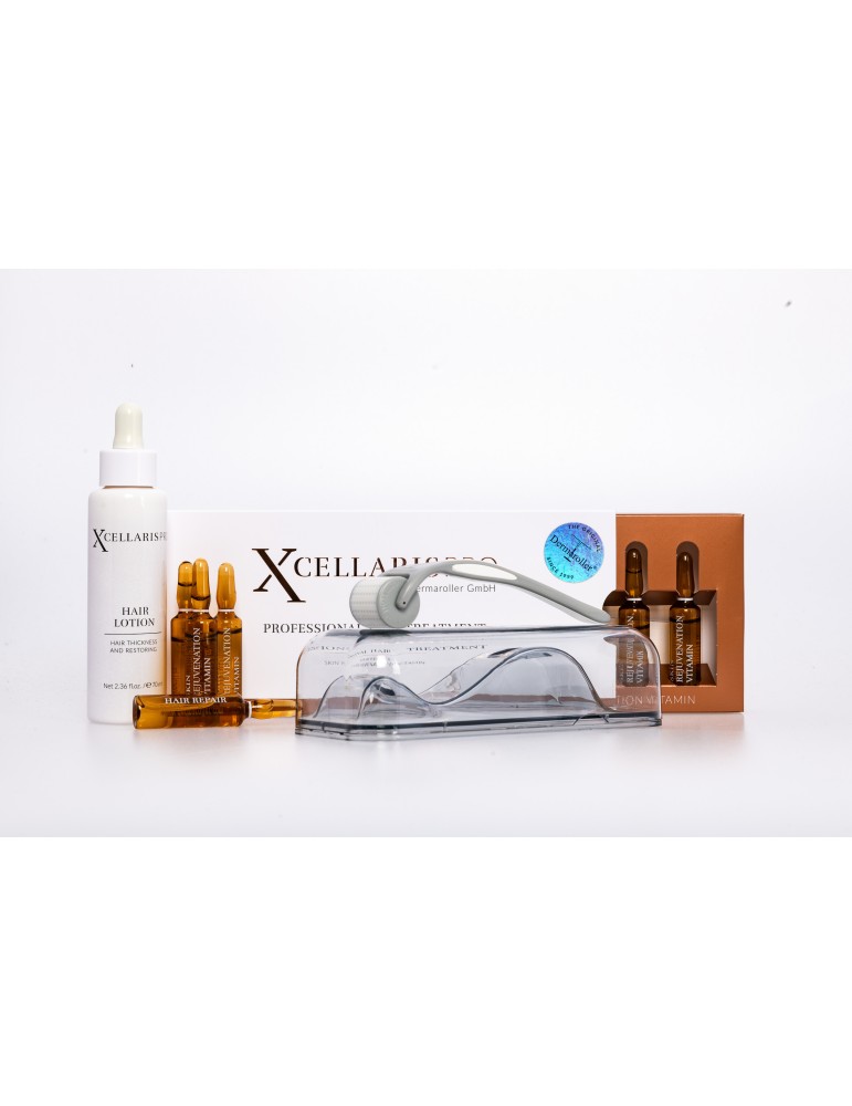 XcellarisPro Hair Loss, el kit original de Dermaroller GmbH para el tratamiento de la caída del cabello . Incluye el Dermaroller HC902, loción capilar y tratamiento capilar profesional.