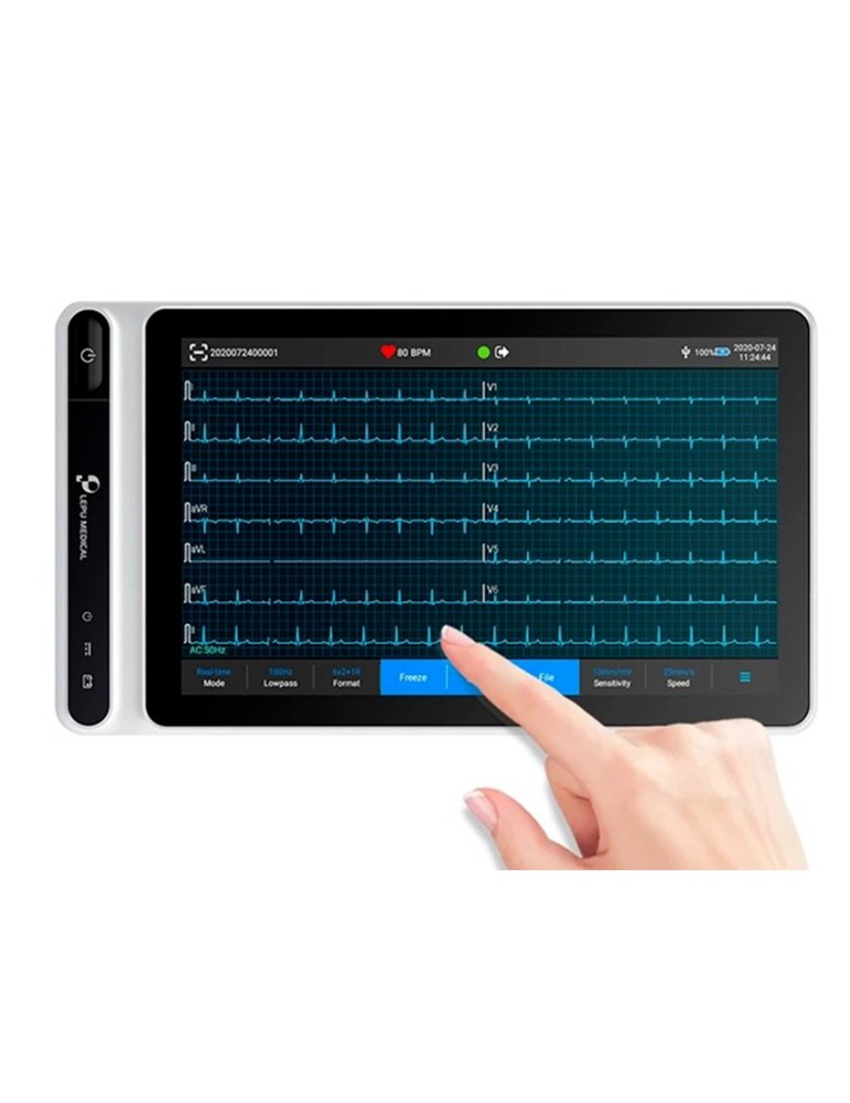 Kevyet ja kannettavat EKG-tabletit 9/12-kytkentäisten aaltomuotojen tallentamiseen ja näyttämiseen sekä sykkeen mittaamiseen. 7 tuuman korkearesoluutioinen ja helppokäyttöinen värillinen kosketusnäyttö. Potilastietojen tallennus, esikatselu, tarkastelu, muokkaus ja lataus langattoman EKG-tietojen siirron kautta mobiiliverkkojen ja Wi-Fi-yhteyden kautta. Potilastiedot voidaan viedä USB-muistitikulle USB-liittimen kautta.