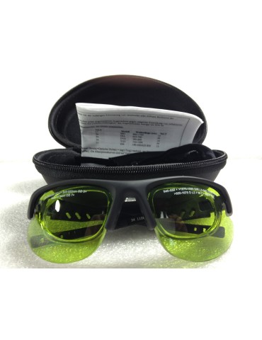 Holmium 2100nm, Erbium 2940nm ja Nd:Yag 1064nm lasersäteilyltä suojaavat lasit, kotelo, olkahihna ja mikrokuituinen puhdistusliina. Mineraalilasit, korkea läpinäkyvyys, VLT 75%.