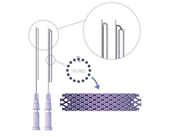 Esteettiset PDO-vetolangat, joissa on Retense 19G 60 mm:n putkimainen sukka ja L-tyyppinen kanyyli.