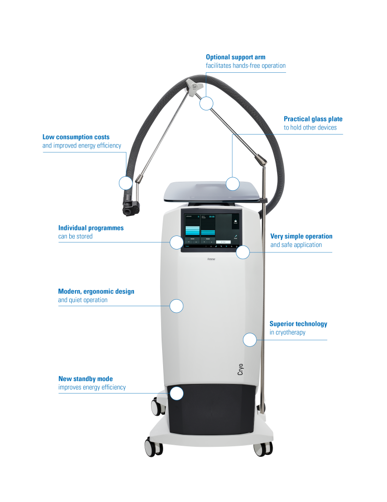 Zimmer Cryo 7 , Refroidisseur d'air froid pour traitements esthétiques et procédures dermatologiques. Cryo 7 est également utilisé en cryothérapie pour traiter certaines maladies du système musculo-squelettique.