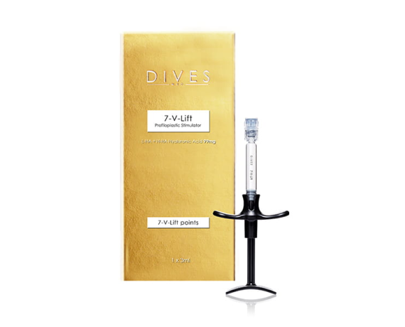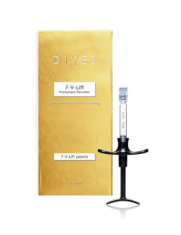 A Dives Med 7-V-Lift egy fejlett szövetstimulátor, amely intenzíven formálja és feszesíti a bőrt a kivételesen magas hialuronsav-koncentrációnak köszönhetően: 99 mg 3 ml-ben. Használata az arc formájának és geometriájának javítására ajánlott, különösen a bőrprofilozás során.