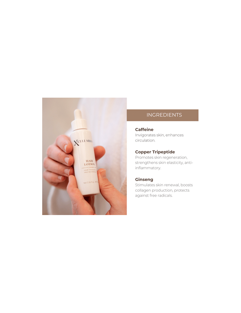 Xcellaris Pro Hair Lotion Original Dermaroller koffeinnel, réz-tripeptiddel és niacinnal, klinikailag tesztelt a hajnövekedés serkentésére, a fejbőr erősítésére, valamint a sűrűség és a volumen növelésére.